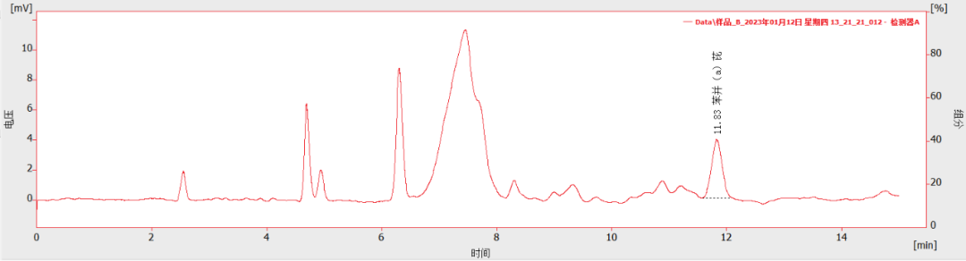 本方案参考GB 5009.27-2016《食品安全国家标准食品中苯并(a)芘的测定》,使用盛瀚CLC-3200高效液相色谱仪对花生油中的苯并(a)芘进行检测。从试验数据可以看出,花生油中的苯并(a)芘能够实现有效分离,目标峰周围无杂质峰干扰,检测灵敏度高,能够满足此类食品样品的检测需求。